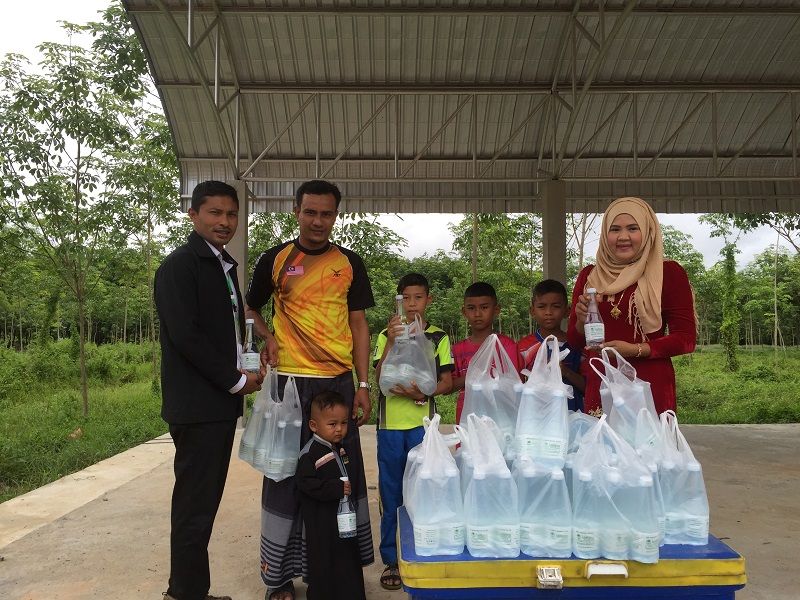 (3) คุณนภาพรรณ ยะลา และคุณดลรอหมาน หลำแหละ ฝ่ายส่วนงานธุรการ เป็นตัวแทนบริษัท มอบน้ำดื่มให้แก่คุณมูหำหมัดนาดี เหมเหาะ เจ้าหน้าที่จัดการแข่งขันกีฬา